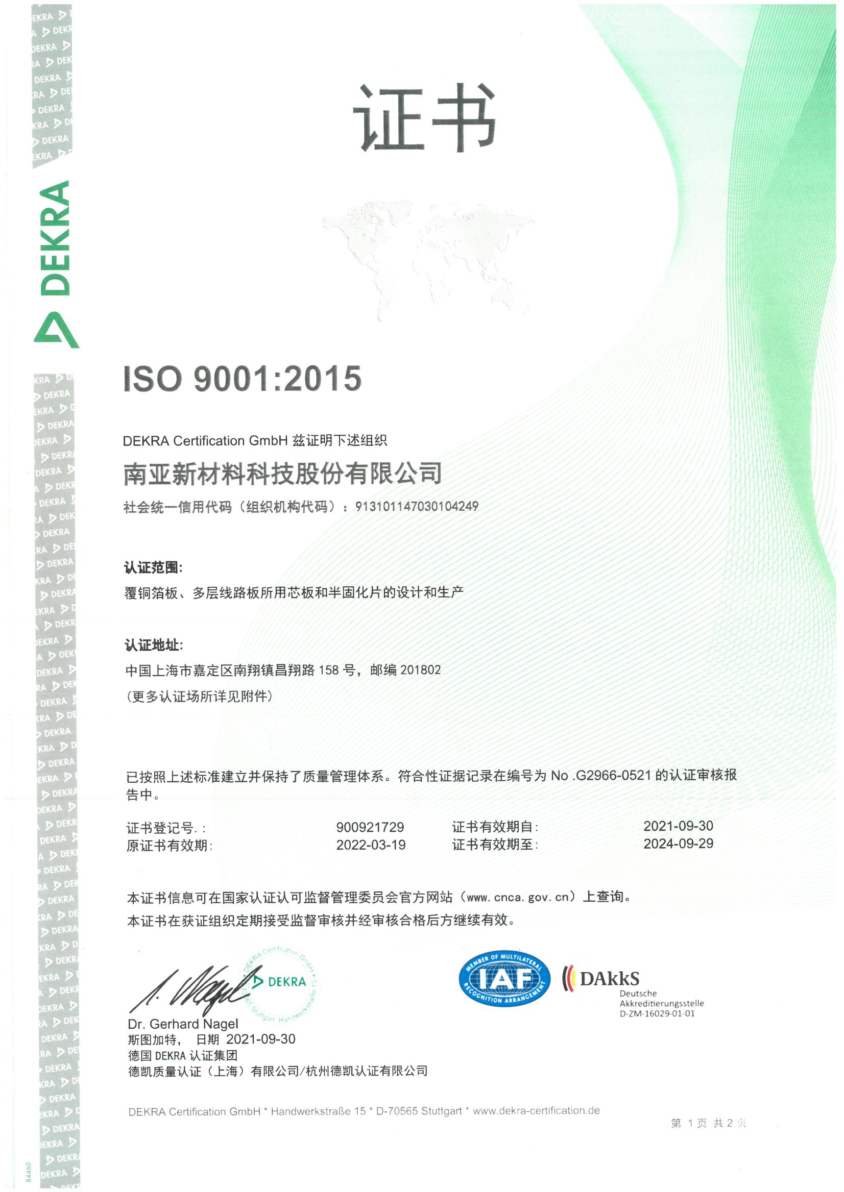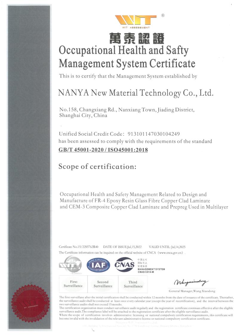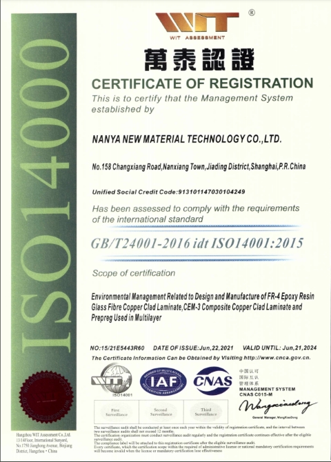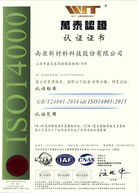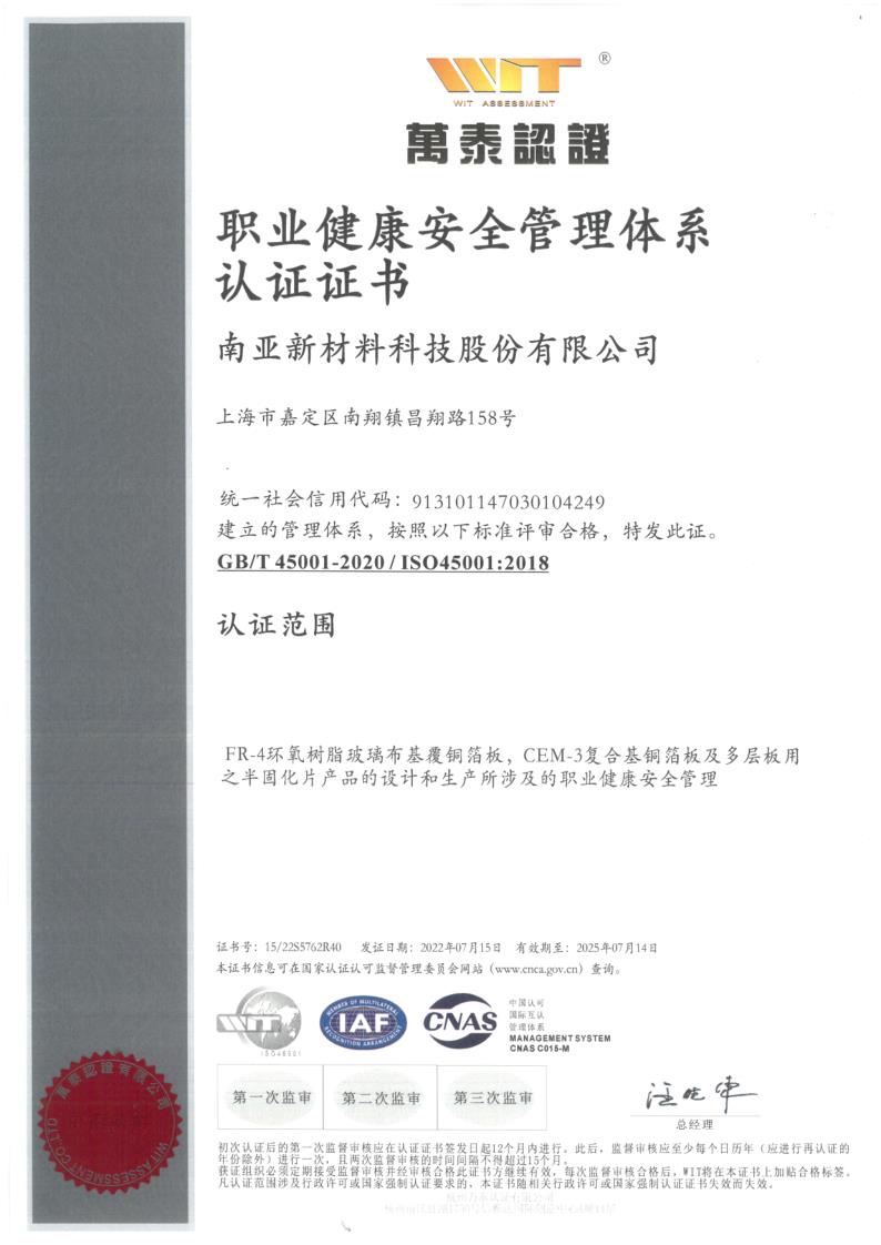 南亞新材始終堅持質(zhì)量就是生命,持續(xù)不斷的改進生產(chǎn)技術(shù)和服務(wù)水平,不斷完善質(zhì)量管理體系,務(wù)求滿足并超越不同客戶的要求和期望;經(jīng)過不懈的努力,公司先后通過了ISO9001質(zhì)量管理體系、 ISO14001環(huán)境管理體系和ISO45001職業(yè)健康安全管理體系的認證及改版升級。